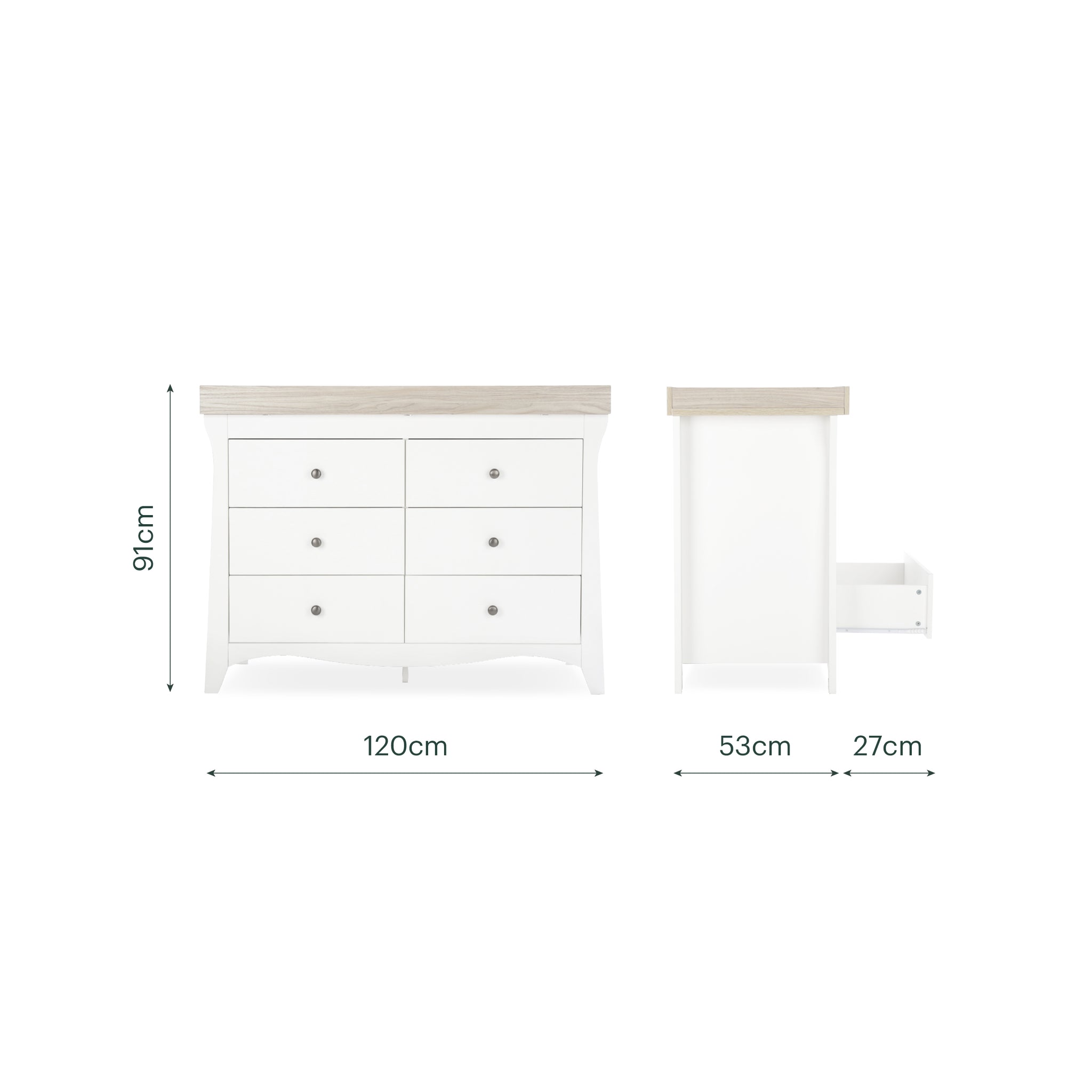 Six generously sized drawers provide ample space for nappies, clothing and everyday essentials, while the removable changing top creates a secure changing area in the early months. Once no longer needed, the unit transitions into a standalone dresser designed to remain useful well beyond the baby stage.